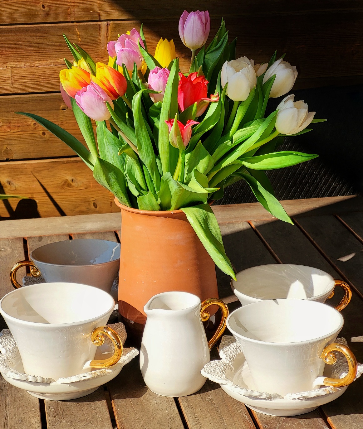 Izdelek je žgan trikrat, počasi na zelo visoki temperaturi- 1050 stopinj C. Skodelica je izdelana na lončarskem vretenu. Material je bela glina, ki je po sestavi podobna porcelanu. Žgana je 2x na 1050 stopinj C. Na roču je 24 karatna pozlata, zato je skodelica žgana še tretjič na 800 stopinj C.